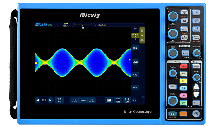 STO1000C系列是Micsig全新發(fā)布的一款便攜式智能示波器。最大帶寬150MHz,采樣率1GSa/s,存儲深度達(dá)28Mpts,最多擁有4個模擬通道,波形捕獲率高達(dá) 80,000 幀/秒;采用高靈敏度的數(shù)字觸發(fā)系統(tǒng),觸發(fā)抖動很小,支持串行總線觸發(fā)和解碼;具備豐富的測量和數(shù)學(xué)運(yùn)算功能;標(biāo)配數(shù)字濾波模塊;支持256級波形灰度顯示與色溫顯示;配有LAN、Wi-Fi、USB Host、USB Device、HDMI、Trigger out等豐富端口;配置800*600分辨率的8英寸工業(yè)電容觸控屏與高度集成控制面板,使得該系列機(jī)型支持三種操作模式:全觸控操作、控制面板操作(無需觸屏)、觸控與控制面板混合操作,結(jié)合Micsig獨(dú)有的觸控算法專利技術(shù),將用戶體驗提升到一個全新的高度。