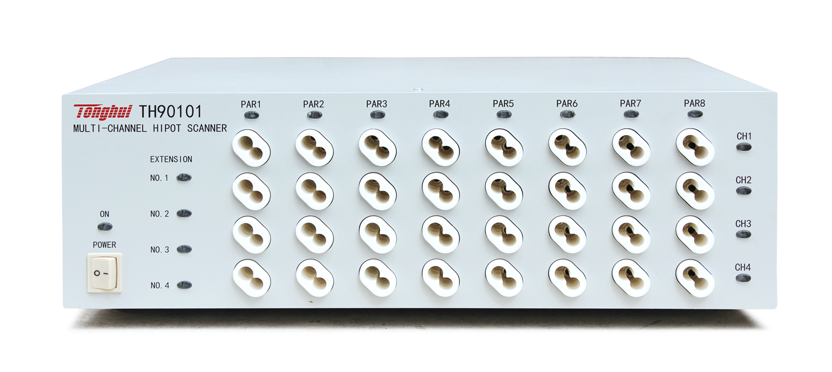 同惠TH90101 多通道高壓掃描器8*4擴(kuò)展,將TH9010每單元擴(kuò)展成4通道;TH9010最大支持四個四通道掃描器,一臺儀器可以拓展至128通道;四同掃描器支持接觸檢查功能同惠TH90101 多通道高壓掃描器