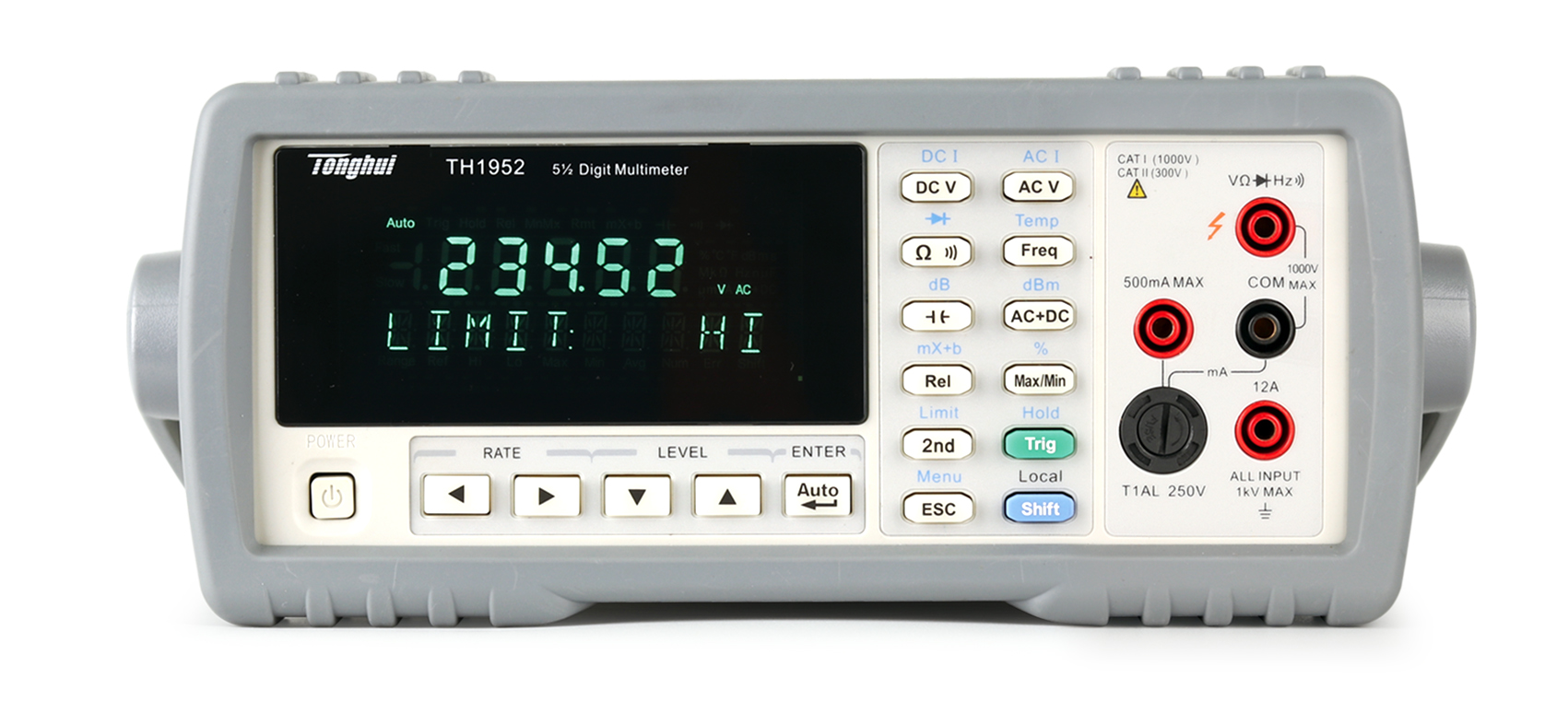 TH1952 五位半數(shù)字多用表簡介■ TH1952型5 1/2 位真有效值數(shù)字多用表是一種多功能、物美價廉的電壓/電流/電阻/電容測試儀。儀器提供120000字的最大讀數(shù),200次/秒最大ADC采樣速度,0.02%的直流電壓準確度等一系列優(yōu)良的性能和經(jīng)濟的價格為廣大客戶提供最優(yōu)的選擇。TH1952提供高亮度VFD雙參數(shù)顯示器,可以同時測量/顯示交流/直流電壓或者電流、交流電壓/電流和頻率等參數(shù),不