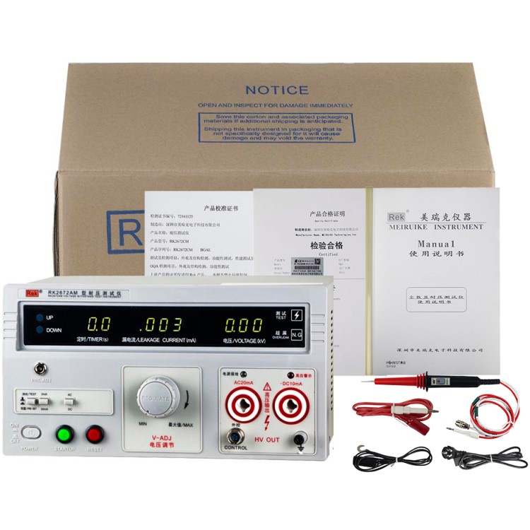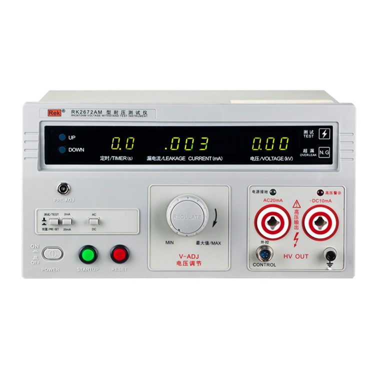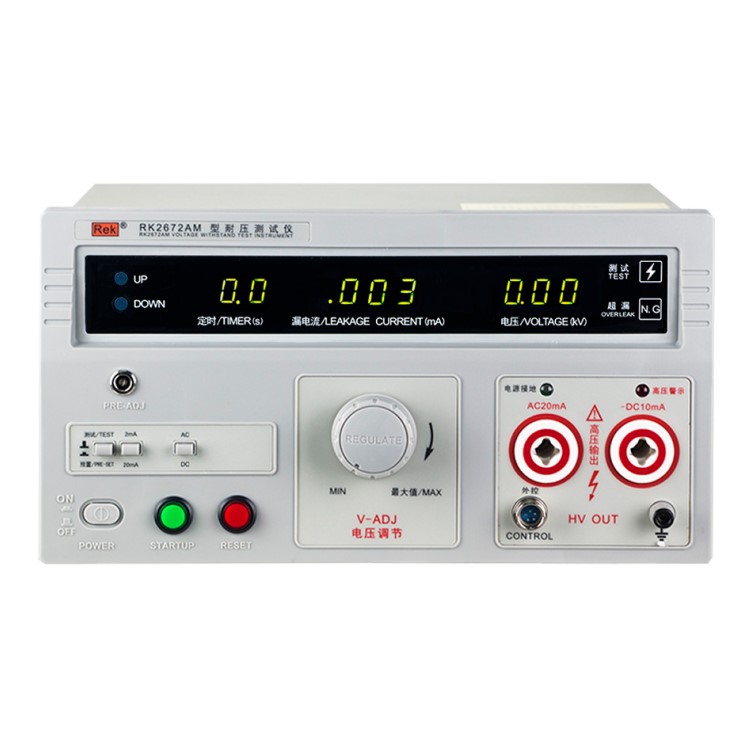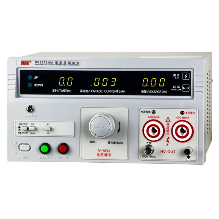 美瑞克RK2672系列耐壓測試儀是測量耐壓強(qiáng)度的儀器,可以直觀、準(zhǔn)確、快速地測試各種被測對象的擊穿電壓、漏電流等電氣安全性能指標(biāo),并可以作為高壓源用來測試元器件和整機(jī)性能。