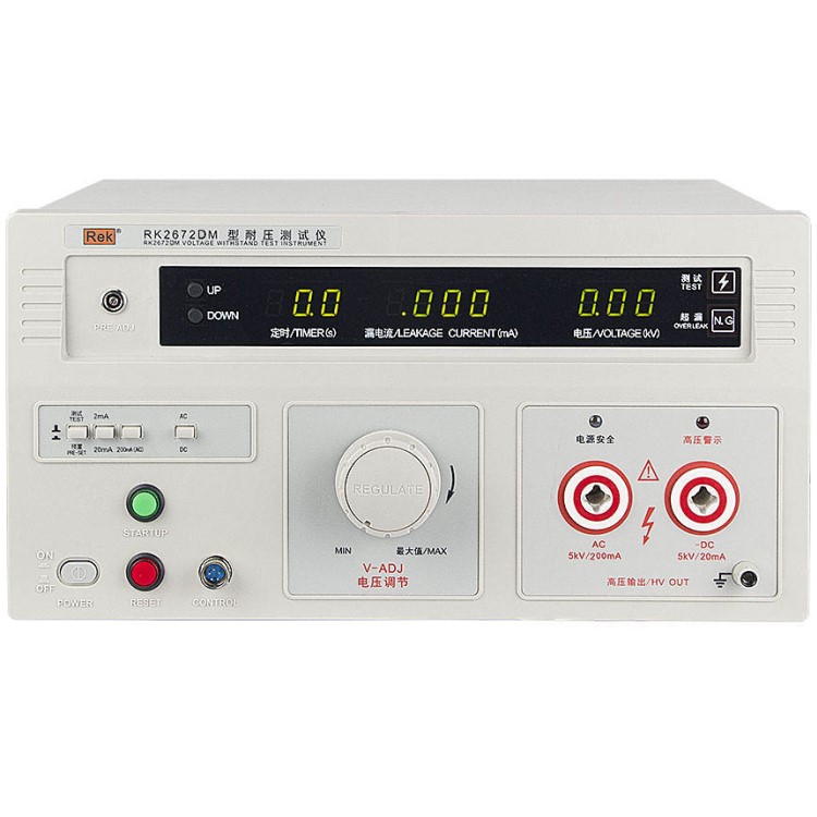 美瑞克RK2672系列耐壓測(cè)試儀是測(cè)量耐壓強(qiáng)度的儀器,可以直觀、準(zhǔn)確、快速地測(cè)試各種被測(cè)對(duì)象的擊穿電壓、漏電流等電氣安全性能指標(biāo),并可以作為高壓源用來(lái)測(cè)試元器件和整機(jī)性能。">