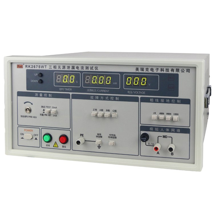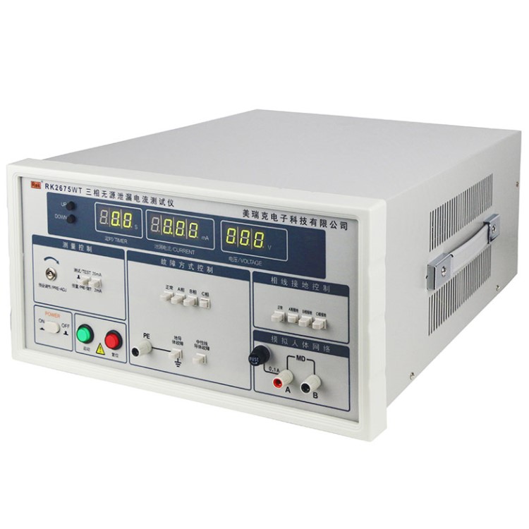 RK2675WT三相泄漏電流測試儀用于測量電器的工作電源(或其他電源)通過絕緣或分布參數(shù)阻抗產(chǎn)生的與工作無關(guān)的泄漏電流,是衡量電器絕緣性好壞以及產(chǎn)品安全性能的檢測實驗設(shè)備。